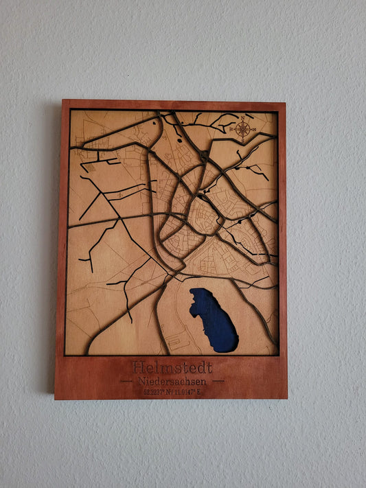 Dekorative Karte von Helmstedt HE Niedersachsen. Kunstvolle Mehrschichtige Holz-Wandkunst Lasergeschnittene 3D Wanddekoration